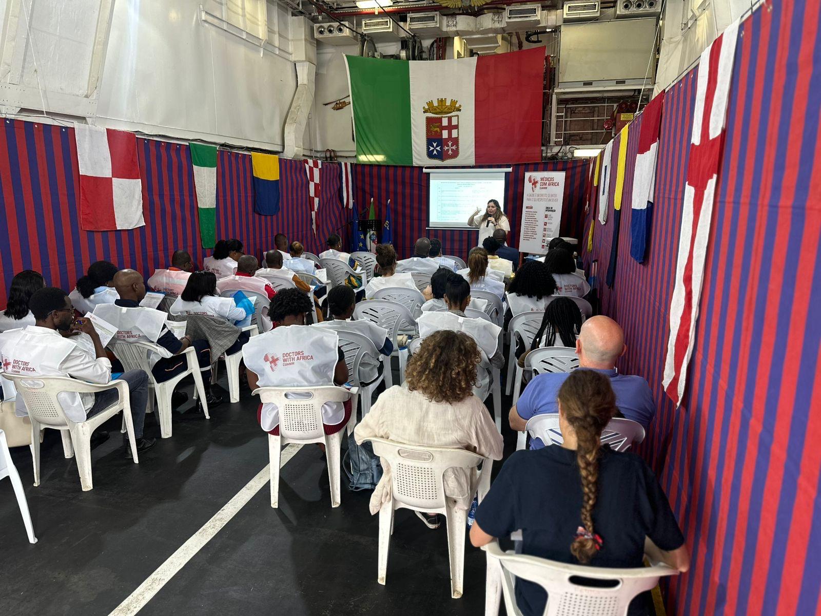 Durante la permanenza, sono state organizzate a bordo diverse attività tra cui, venerdì 6, la Conferenza “Maritime Security Challenges in Angola – Desafios da Segurança Maritima em Angola” alla quale hanno preso parte autorità civili e militari angolane, rappresentanti del corpo diplomatico dei Paesi dell’Unione Europea, dei Paesi che affacciano sul Golfo di Guinea e membri dell’Architettura di Yaoundé, e numerosi Addetti per la Difesa accreditati in Angola. L’evento ha consentito di fornire aggiornamenti sugli sviluppi della situazione nel Golfo di Guinea con riferimento alle principali sfide che contraddistinguono le operazioni condotte nella regione e ribadire l’attenzione della diplomazia italiana e della nostra Marina Militare all’obiettivo condiviso con i Paesi rivieraschi del Golfo di Guinea di contribuire alla sicurezza della navigazione nel quadrante, un’area strategica, bersaglio di attacchi di pirateria e di altri crimini in mare, tra cui la pesca illegale, il traffico di droga e di esseri umani, nonché l’inquinamento indiscriminato. Il 7 giugno, l’Hangar della nave ha ospitato il seminario di formazione intitolato “Just In Time in contesti di risorse limitate”, organizzato in collaborazione con Medici con l’Africa – CUAMM, indirizzato alle entità angolane del settore, e a cui hanno partecipato partner internazionali quali OCHA, OMS e PAM nonché OSC italiane attive in Angola quali il Volontariato Internazionale per lo Sviluppo (VIS) e Cooperazione Sviluppo Paesi Emergenti (COSPE).