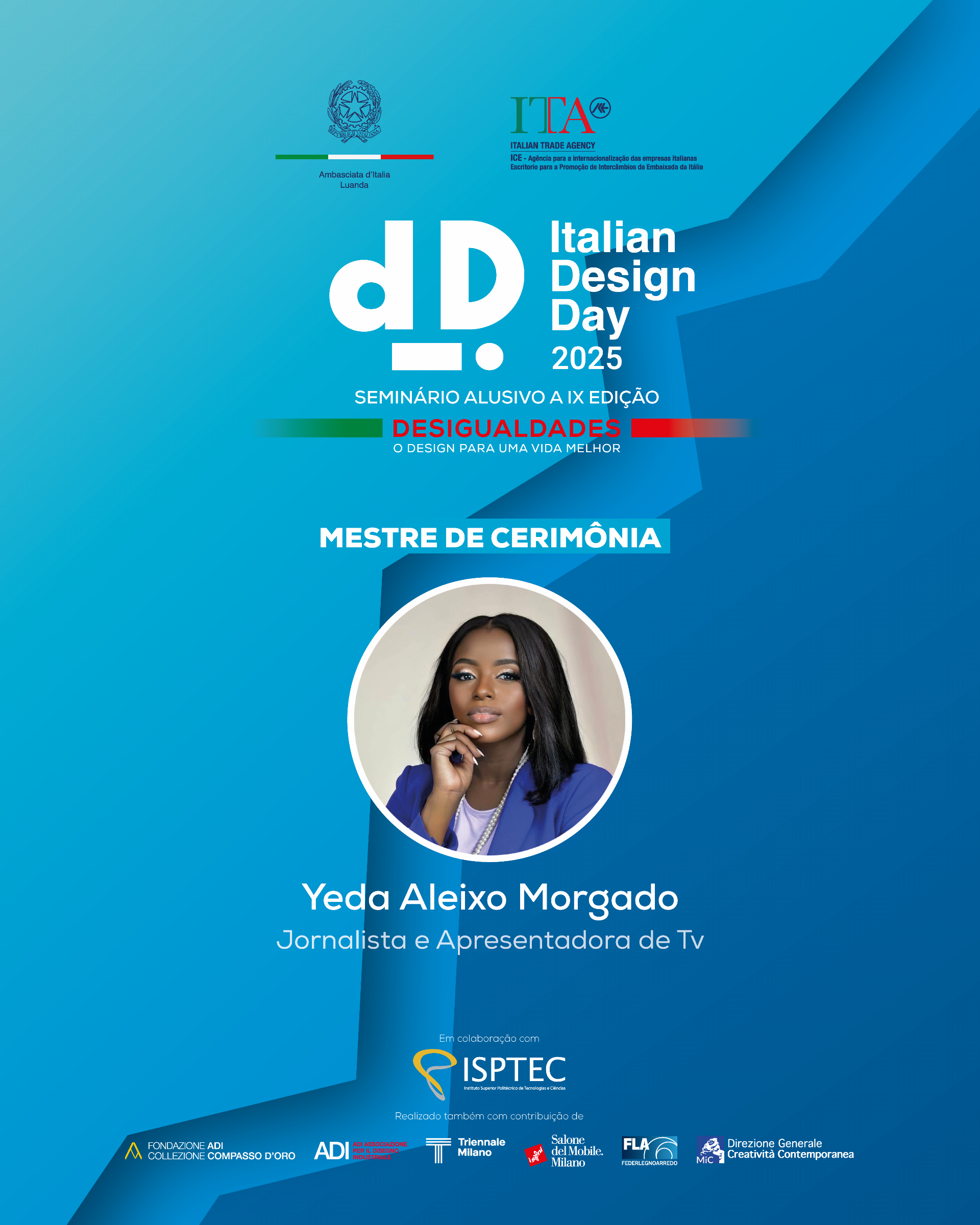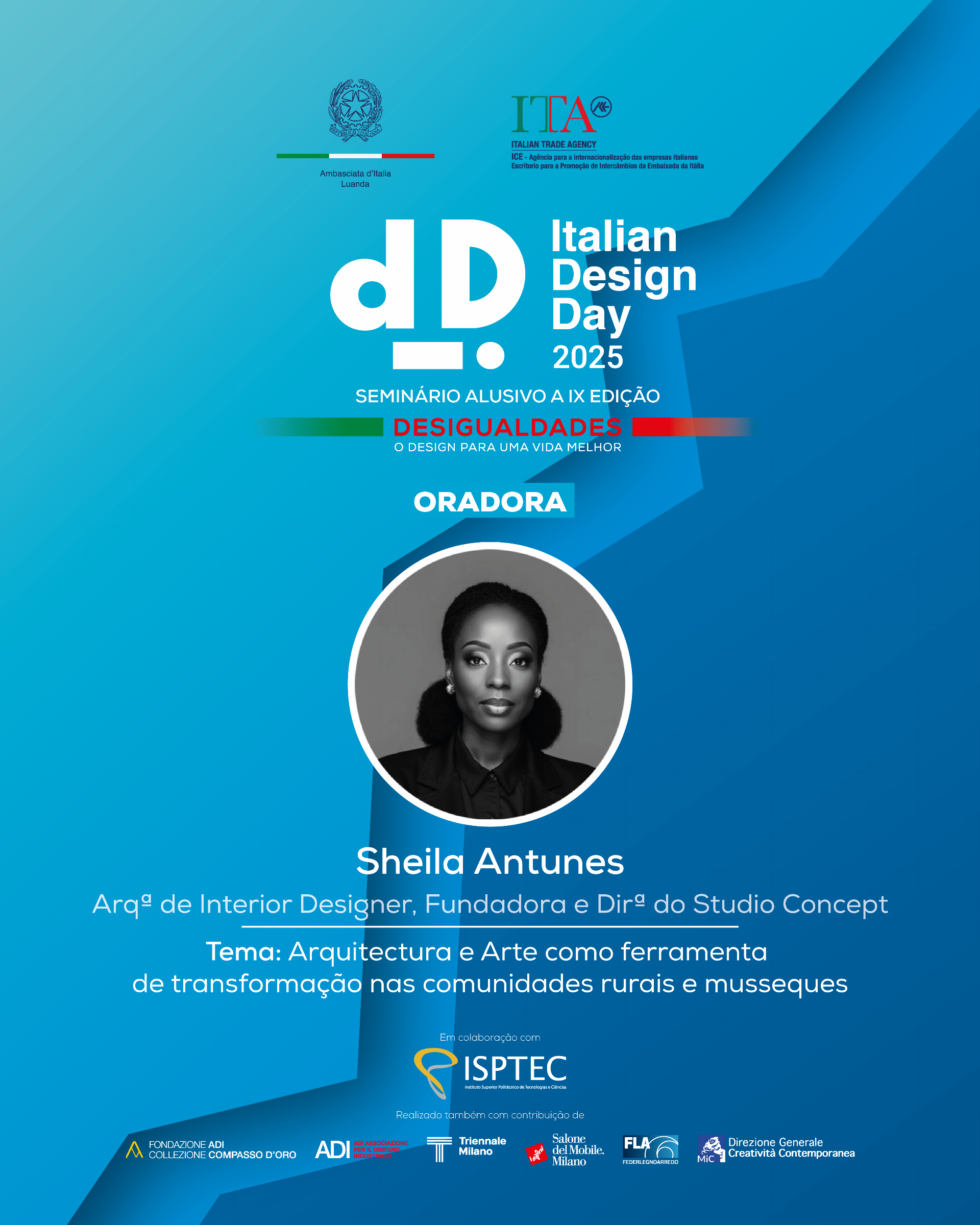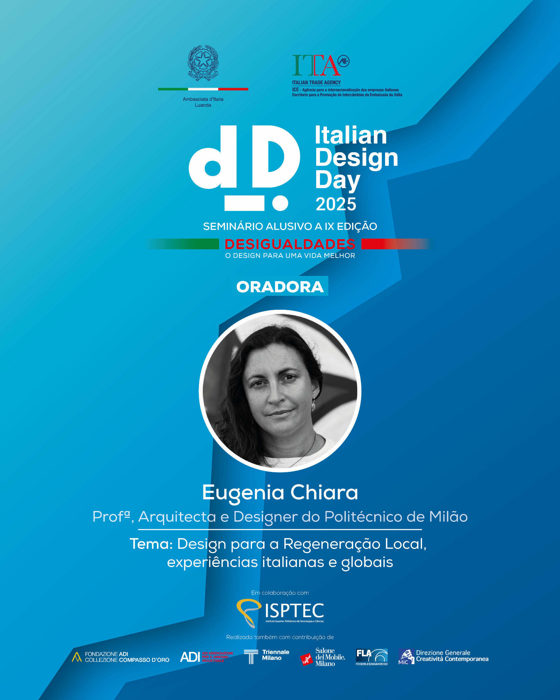 Por ocasião da IX edição do Dia do Design Italiano (Italian Design Day), realizou-se em Luanda, no ISPTEC – Instituto Superior Politécnico de Tecnologias e Ciências, o Seminário com o tema “Desigualdades. O design para uma vida melhor”, organizado pela Embaixada de Itália em colaboração com a ITA – Italian Trade Agency de Luanda, na presença de membros do executivo, do corpo diplomático, de representantes do mundo empresarial, académico e artístico local, além de estudantes de várias Universidades de arquitectura da capital com as quais a Embaixada mantém uma colaboração de longa data (Universidade Agostinho Neto, Universidade Lusíada, Universidade Católica, Universidade Óscar Ribas, Universidade Jean Piaget e ISPTEC, bem como numerosos alunos dos cursos de italiano promovidos pela Embaixada nas Universidades Lusíada e Católica).